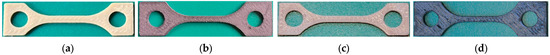 Images of printed tensile test specimen: (a) PEEK (type A); (b) CF30 PEEK (type B); (c) PEEK with 1.6 Vol% copper particles (type A); (d) PEEK with 2.3 Vol% CNT (type B).