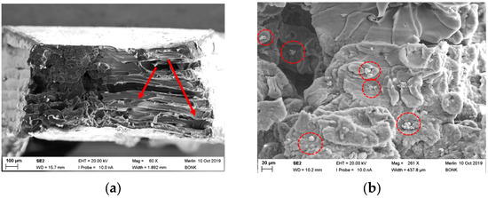 As depicted from Figure 6b, the CF30 PEEK possesses its maximum tensile strength at a printing temperature of 485 °C and a printing speed of 20 mm/s; in all cases, a pronounced brittle behavior could be observed. Figure 9a shows the related fracture image. In contrast to the pure PEEK samples, a pronounced granular and rough surface is shown. A pull-out of the fibers out of the PEEK matrix cannot be observed, which can be interpretated as a good chemical coupling between the matrix and fiber, resulting in a reliable mechanical transfer of the applied tension to the high-resistant fiber. In the middle of the specimen, individual printed layers (dashed lines) without delamination under stress are shown. Due to the difficulties during filament compounding, only a very few number of tensile tests applying the new PEEK CNT composite could be performed. Figure 9b shows the fracture image of a sample printed at 440 °C. Individual layers of variable heights can be identified (red arrows), some voids (yellow arrows) between the layers are visible also. The fractured surface of the PEEK copper composite is presented in Figure 10 at different magnifications. In Figure 10a, the overview shows a lamellar appearance (red arrows) with delamination like the one seen from pure PEEK (Figure 8a). Small voids are located between the layers. A closer look at a higher magnification (Figure 10b) to the upper left section shows a different surface appearance. Via EDX, the small particles could be identified as copper particles (Figure 10b, red circles). It is apparent that either a phase separation occurred, or a poor compounding with insufficient homogenization and unwetted copper particles was presented, which is a more realistic outcome.