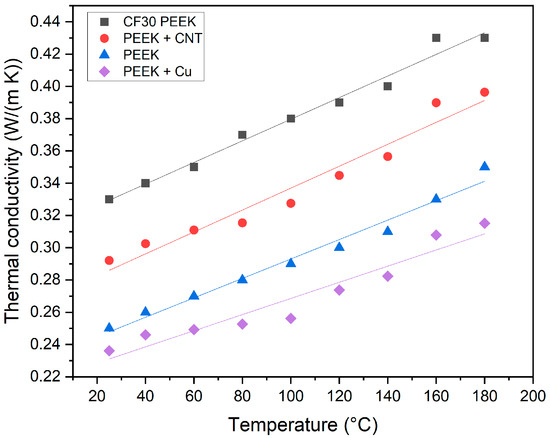 All of the used fillers possess a higher thermal conductivity than the pure PEEK (Table 1 and Table 2). With respect to the usage of PEEK-based matrix composites, e.g., as mold insert material, the thermal conductivity must be significantly enhanced due to the essential mold insert tempering during the injection molding cycle, enabling successful molding and demolding. Figure 11 shows, for the investigated materials, the change of the thermal conductivity with temperature. Due to the test machine’s requirements, suitable specimens with optimized printing parameters were printed (Table 8).