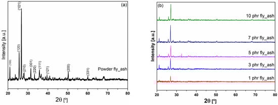 The XRD diffractographs of fly ash/epoxy composites at various filler concentrations are shown in Figure 1, along with the XRD pattern of fly ash powder. No diffraction peaks can be seen in the XRD graph of the amorphous polymer matrix. Therefore, all the peaks seen in the nanocomposites’ patterns originate from the fly ash filler, proving that the particles were successfully dispersed throughout the epoxy. The recorded peaks are in accordance with those reported previous studies on the same type of fly ash []. In addition, as predicted, the filler’s concentration increases the intensity of the peaks.