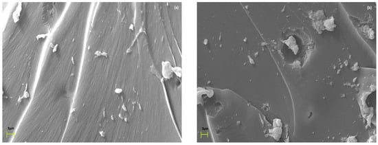The maximum values of the storage modulus as a function of fly ash content are plotted as a bar graph in Figure 4b, further elucidating this behavior. As the amount of reinforcing phase particles increases, the maximum values of the storage modulus rise, which can be considered a strong indication of the particles’ fine dispersion []. The results of the DMA tests agree with those of the static mechanical analysis presented earlier.
