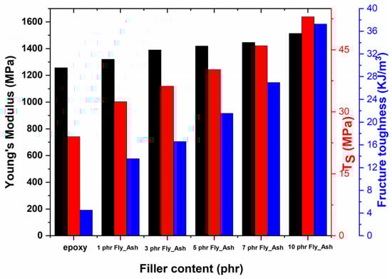Figure 3 displays the outcomes of the static mechanical tests. Tensile stress–strain plots were used to derive values of Young’s modulus, tensile strength, and fracture toughness for each system. Elastic modulus steadily rises with the percentage of fly ash added to a material. Filler content has a significant impact on tensile strength and fracture toughness, elucidating the reinforcing ability of fly ash on mechanical properties and the strong adhesion of reinforcing particles with the matrix. At higher filler contents, the values of tensile strength and fracture toughness increase by multiple times with respect to the unfilled polymer matrix. In general, fly ash increases the mechanical durability of nanocomposites, and the employed particles do not act as stress concentration points or stress raisers within the epoxy matrix. The latter should lead to a considerable decrease in both tensile strength and fracture toughness with filler content. This seems to be consistent with the results of DMA testing.