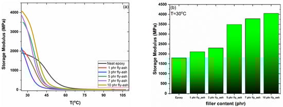 Figure 4 depicts the thermomechanical behavior of all the systems studied as determined via DMA data. The effect of temperature and the percentage of the reinforcing phase on the storage modulus is depicted in Figure 4a. As the temperature rises, the polymeric matrix changes from a rigid glassy state to a viscous rubber- one, as evidenced by the decrease in all the curves. Storage modulus values increase systematically with fly ash content, demonstrating the reinforcing ability of metal oxide particles in the glassy state.