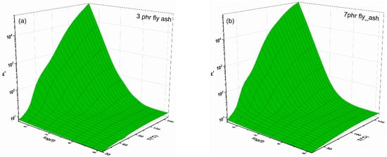Due to their free-charge carrier’s low density, polymer composites are classified as electrical insulators; as such, their electrical properties should be related to dielectric relaxation phenomena that occur under AC conditions. The relaxation processes, resulting from the orientation of the permanent and induced dipoles, are associated with the space charge’s migration and the presence of dipolar groups in the polymeric chains. Using three-dimensional graphs of the real part of dielectric permittivity (ε′) and loss tangent (tan δ) as functions of frequency and temperature, Figure 5 and Figure 6 show the dielectric response of the nanocomposite systems with 3 phr of and 7 phr of fly ash, as the reinforcing phase.
