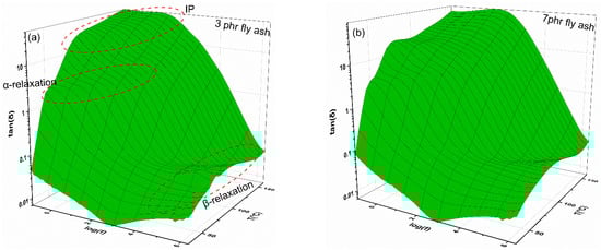 Figure 6 shows 3D loss tangent spectra, which provide a clearer picture of these processes. The loss tangent (δ) is plotted against temperature and frequency in Figure 6 for the same samples as those in Figure 5. The recorded three peaks in the spectrum of dielectric loss can be interpreted as evidence of different relaxation processes. In particular, large dipoles are formed at the interface between the epoxy resin and the fly ash inclusions, because of the accumulation of unbounded charges. The effect is amplified when the temperature and the frequency are high and low, respectively. The large size of these dipoles gives them increased inertia, so their alignment with the applied field requires a longer time and thermal agitation, resulting in high permittivity values in this region. Interfacial polarization (IP) describes this type of polarization process. The process taking place in the intermediate zone is a reflection of the glass-to-rubber relaxation of the epoxy matrix (α-relaxation).
