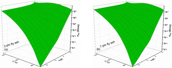 AC conductivity as a function of frequency and temperature for the composites with (a) 3 phr and (b) 7 phr fly of ash content.