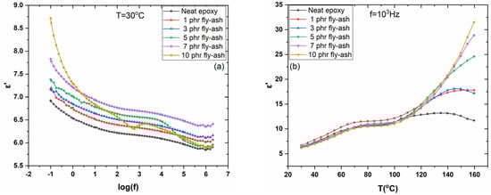 Figure 8a shows the real part of dielectric permittivity against frequency for each of the examined systems at 30 °C. The increase in ε′ with the filler content reveals an additional aspect of the reinforcing ability of the fly ash particles. When compared to neat epoxy, all reinforced systems show greater values of ε′. In addition, it is well-observed that ε′ values decrease as the frequency increases because of the reduction in polarization. In Figure 8b, the variation of the real part of dielectric permittivity versus temperature, at constant frequency of 1 kHz, for all studied systems can be seen. The gradual increase in ε′ in the temperature range between approximately 40 and 80 °C is related to the facilitation of dipole orientation in the region where glass-to-rubber transition takes place. The more intense increase in ε′ values above 120 °C is attributed to IP, which occurs at high temperatures and is dependent on the heterogeneity of the composites [,]. Apparently, the real part of dielectric permittivity increases with fly ash content as a result of the enhancement of interfacial polarization because of the increase in the systems’ heterogeneity. Dielectric permittivity is greater in the fly ash-reinforced samples than in the insulating matrix. For this reason, the reinforced systems achieve greater values of ε′ across the entire temperature and frequency spectra.
