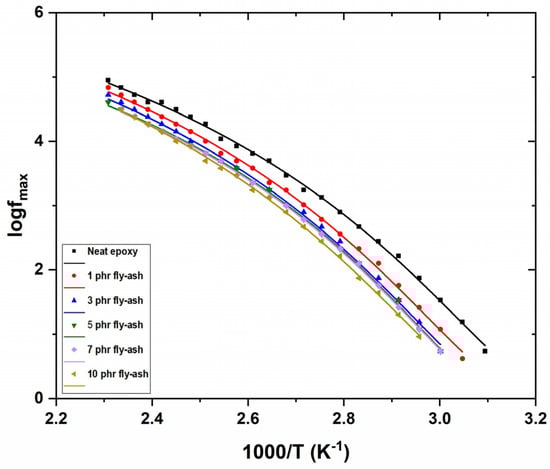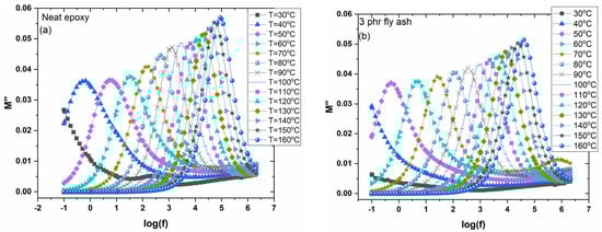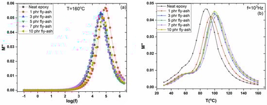 Figure 9a,b shows the loss modulus peaks for the unfilled epoxy matrix and the system with 3 phr of fly ash at the frequencies where transitions occur in the ε′ 3D spectra, at various temperatures. The intensive peaks are indicative of the glass-to-rubber transition. As the temperature rises, the loss peaks increase in frequency due to the frequency–temperature superposition. At temperatures between 50 and 100 °C, the rate of the main peak’s shift appears constant, while at higher temperatures, the peak shift rate decreases alongside an accompanying increase in loss modulus maxima. The shrinking of the free volume is responsible for this variation [,,,]. It is interesting to note that there is a tendency of the second peak to be formed at the high-frequency edge. This peak is attributed to β-relaxation. Figure 10a shows the frequency dependence of the imaginary part of the electric modulus (M″) for all studied systems at 160 °C. The formation of a loss peak indicates the presence of an α-relaxation mechanism in all samples. The peak of α-relaxation is related to the glass transition temperature (Tg) of the amorphous polymer matrix. The thermal energy absorbed by macromolecules near Tg allows the cooperative segmental motion of significant portions of the polymer chains. The presence of strong or weak interactions between the polymer matrix and fillers is indicated by a shift in the loss peak to lower or higher frequencies at a constant temperature, depending on the amount and type of embedded particles [,,,,]. Figure 10b depicts the electric modulus loss index (M″) as a function of temperature, at 1 kHz for all tested systems. In all spectra, the formation of two peaks is evident. The main peak is assigned to α-relaxation and its shifting toward higher temperatures, with the fly ash particles’ content, which implies an increase in the glass transition temperature, and which can be considered a result of strong adhesion/interactions between particles and macromolecules. The weaker peak recorded at low temperatures is ascribed to β-relaxation and occurs because of the rearrangement of polar side groups of the main polymer chain. The loss peak frequency’s position allows the determination of the relaxation time. Representative results are listed in Table 2.