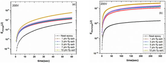 Figure 12a,b shows the stored and retrieved energies as a function of time for all investigated systems and for a charging voltage of 200 V. Since the integrated fly ash inclusions act like a dispersed network of capacitors, both energies enhance as the filler percentage rises. This network defines a microscale active device that is capable of performing a rapid charging and discharging process for the stored/retrieved energy. Using Equation (4) and by integrating the time-dependent charge/discharge current functions, the stored and retrieved energy can be evaluated.