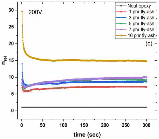 Figure 12c shows the time dependence of the relative coefficient of energy efficiency for the systems studied at a 200 V charging voltage. It is apparent that the ability of retrieving energy is improved with filler content and in the system with the highest fly ash content, the low-frequency edge approaches 30 times the ability of the storing/retrieving energy of the neat epoxy resin.