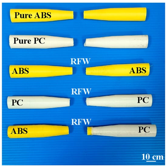 - Kuo, C.-C.; Gurumurthy, N.; Chen, H.-W.; Hunag, S.-H. Mechanical Performance and Microstructural Evolution of Rotary Friction Welding of Acrylonitrile Butadiene Styrene and Polycarbonate Rods. Materials 2023, 16, 3295. [Google Scholar] [CrossRef] [PubMed]