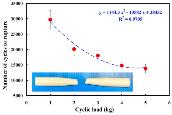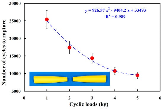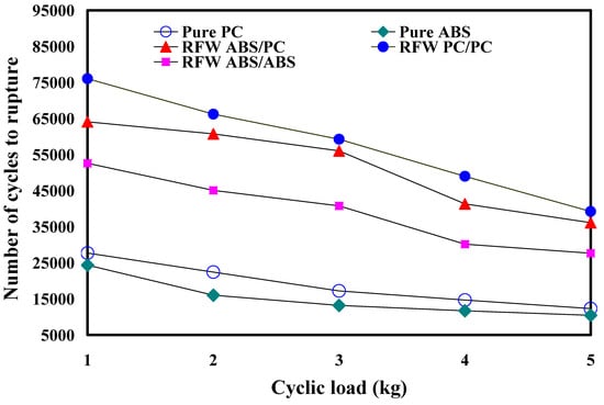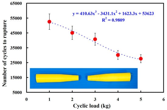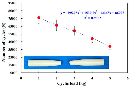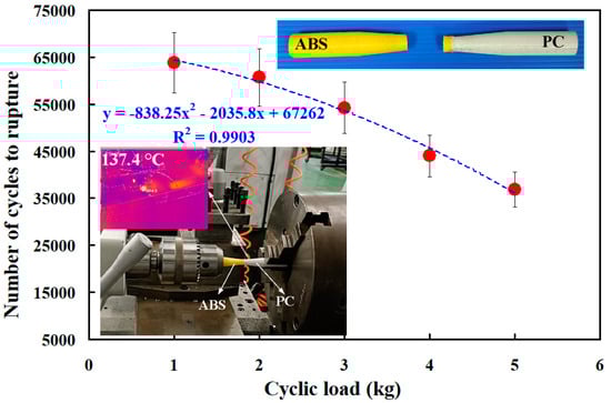 - The fatigue life of the RFW of ABS/PC is shorter under higher loads. The number of cycles until failure (y) can be determined by the cyclic load (x) according to the prediction equation of y = −838.25x2 − 2035.8x + 67,262, with a correlation coefficient of 0.9903.