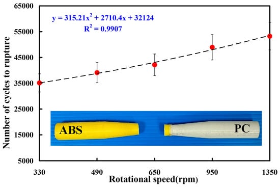 - The fatigue life of the RFW of ABS/PC dissimilar components increases with an increased rotational speed. The number of cycles until rupture (y) can be determined by the rotational speed (x) according to the prediction equation of 315.21x2 + 2710.4x + 32,124, with a correlation coefficient of 0.9907.