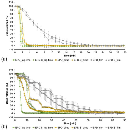 Lag-time and dissolution of a film and honey syrup with and without a sponge-like insert: (a) stimulated modus, (b) unstimulated modus (n = 3, +/− SD) EPD = EsoPeriDiss, EPD-S = Eso-PeriDiss with sponge.
