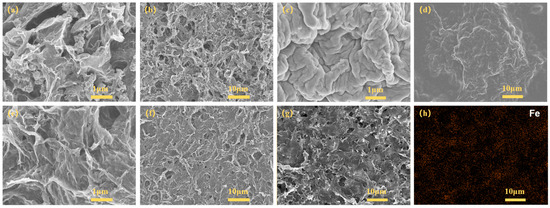 SEM images of (a,b) the Fe3O4@GO composites; (c,d) Fe3O4@GO/PEDOT:PSS hybrid films as prepared; (e–g) Fe3O4@RGO/PEDOT:PSS flexible free-standing films after acid treatment; (h) the corresponding EDS mapping image of (g) Fe3O4@RGO/PEDOT:PSS.