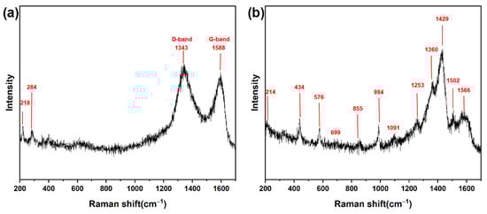 Raman spectra of the obtained hybrid films: (a) Fe3O4@GO/PEDOT:PSS films before acid treatment and (b) Fe3O4@RGO/PEDOT:PSS films after acid treatment.