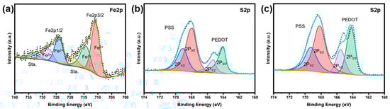 In order to further investigate the elemental composition and chemical state of the obtained composite films, X-ray electron spectroscopy (XPS) analysis was conducted, and the results are shown in Figure 4 and Figure S2. As depicted in the XPS survey spectrum (see Figure S2), after acid treatment the porous Fe3O4@RGO/PEDOT:PSS contains elements of Fe, C, O, and S. The high resolution of the Fe2p spectra was decomposed, and the result is shown in Figure 4a. As presented, Fe2+ is predominantly correlated with the peaks at 711.2 (Fe2p3/2) and 724.5 eV (Fe2p1/2), while Fe3+ is mainly associated with the peaks at 713.8 (Fe2p3/2) and 726.7 eV (Fe2p1/2) [37,38]. Additionally, the satellite peaks at 719.1 and 731.8 eV belong to Fe2+ and Fe3+, respectively [37]. All these phenomena illustrate the presence of residual Fe3O4 even after a relatively lengthy treatment with HClO4 and HI, which serve an important role in electrochemical performance.