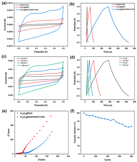 In addition, EIS measurement was conducted to investigate the ion diffusion and electron transfer resistance of the prepared electrodes. As can be seen from Figure 5e, the Nyquist curve mainly consists of two parts: the high-frequency Nyquist curve is composed of a semicircle, while the low-frequency curve is made up of a nearly straight line. Generally, the semicircle diameter at high frequency is related to the charge transfer resistance (Rct). To be specific, the Fe3O4@RGO possesses a charge transfer resistance of around 50 Ω. It is worthy to note that, after being wrapped with PEDOT:PSS, the electrode shows a marked decline in Rct value. Furthermore, the slope of the Fe3O4@RGO/PEDOT:PSS electrode at lower frequencies is very similar to that of the Fe3O4@RGO, indicating that good diffusive behavior of the electrolyte ions is maintained after PEDOT:PSS addition. All results of these EIS analyses are consistent with those collected from the CV and GCD studies, illustrating that the PEDOT:PSS wrapping indeed facilitates efficient ion transport and consequently enhances its capacitance performance. Moreover, a further cyclic stability test was carried out, and the result reveals that even at a very high current density (20 A g−1), the Fe3O4@RGO/PEDOT:PSS integrated electrode film still retains nearly 70% of its original capacitance when it is charged and discharged for 800 cycles (see Figure 5f).