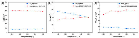 The electrical conductivity (a), Seebeck coefficient (b), and power factor (c) of Fe3O4@RGO and Fe3O4@RGO/PEDOT:PSS composite films from 300 to 380 K.