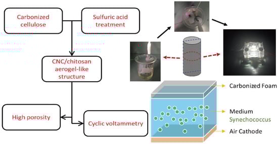 Microcrystalline cellulose (MCC) was hydrolyzed chemically. The MCC was purchased from Acros Organics. The diameter of the MCC was 50 μm and the Chitosan was provided from Sigma Aldrich. For the hydrolysis, sulfuric acid and filter paper with a pore size of 700 nm were supplied by Ducksan Chemical (Yongin, Republic of Korea) and Hyundai Micro (Seoul, Republic Korea), respectively. A cyanobacterial strain, Synechococcus, was obtained from the Korea Research Institute of Bioscience and Biotechnology (KRIBB) and grown in a BG-11 medium in an incubator with shaking at 25 °C. The microalgae were harvested on day 30. 2,5-dimethyl-1,4-benzoquinone (DMBQ), mediator was purchased from Sigma Aldrich (St. Louis, MI, USA). The platinum mesh was purchased from Ametek Inc. (Berwyn, PA, USA). MEET Co. (Seoul, Republic Korea) supplied carbon felt, and Nafion membrane was purchased from Dupont (Wilmington, DE, USA).