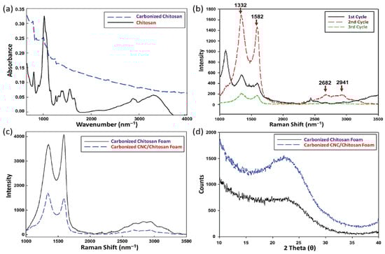 Both carbonized chitosan foam and CNC/chitosan foam exhibited graphitic peaks. The carbonized CNC with fewer chemical functional groups had excellent chemical stability to utilize an electron carrier [].