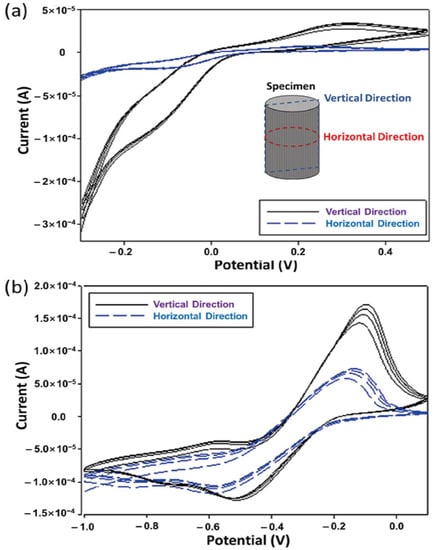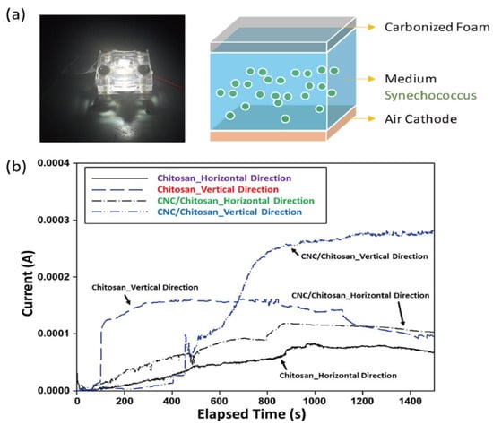 where is the crystallinity index of a specimen, is the max intensity in 200 plane peaks, and is the min intensity between 200 and 100 plane peaks. From the calculation results in Table 2, the crystallinity was approximately 14.0% and 24.0%, which showed the carbonized chitosan and CNC/chitosan foams, respectively. The pure chitosan specimen showed a larger crystal size but smaller crystallinity than the CNC-filled specimen. This implied that the added nanoparticle could serve as a nucleation site, thus leading to the relatively high crystal portion in the matrix. Figure 4 shows the recyclable voltammetry results of the specimens. The voltammetric behavior’s several cycles observe applied voltage and mass (or reactant) transport due to the concentration polarization and over-potential effect. It founds that the carbonized CNC/chitosan foam had a higher peak current than the carbonized chitosan foam. Note that the prepared sample possessed an anisotropic internal structure after freeze-drying, and the carbonized CNC/chitosan foam exhibited excellent recyclable behavior. Therefore, two kinds of samples were prepared for cutting in the vertical or horizontal direction, as shown in the inset. Interestingly, the vertical sample showed more extensive electrochemical characteristics than the horizontal sample. On the other hand, renewable energy harvesting is a comprehensive study to replace fossil fuel energy production. In particular, energy production using living cells, such as microbial fuel cells (MFC) and bio photovoltaic cells (BPV), is an attractive energy harvesting method. In this study, the BPV system using cyanobacteria (i.e., Synechococcus) employs to evaluate the possibility of usage as a carbon electrode. Figure 5 presents the chronoamperometry analysis result of the sample. Like the cyclic voltammetry result, the vertically prepared sample offered a higher current than the horizontally prepared sample. This indicates the existence of an anisotropic structure in the sample [,]. In addition, the CNC/chitosan sample possessed higher current values than the only chitosan sample due to the relatively dense internal structure of the CNC-embedded sample.