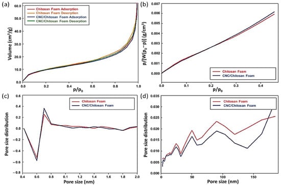 Gas physisorption result of the uncarbonized chitosan foam and CNC/chitosan foam: (a) hysteresis loops; (b) BET analysis of adsorption isotherm and pore size distributions obtained from (c) MP and (d) BJH analyses.