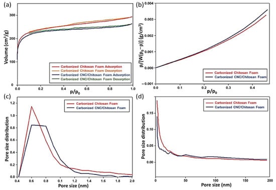 where is the mass of gas adsorbed as monolayer at a relative pressure , is the actual vapour pressure of adsorbate, is the saturated vapour pressure, is the BET constant, and is the required mass of gas adsorbed in a complete monolayer. Figure 6 shows the result of sample gas physisorption before carbonization, and Table 3 lists related calculations. Gas physisorption is an experimental technique based on the Van der Waals interaction between gas molecules and solid particles. Figure 6a presents the hysteresis loops of the samples. Depending on the particle structure, this obtains the different loops. For instance, a porous material with a solid adsorbent–adsorbate interaction offers Langmuir isotherm (i.e., steep uptake at low pressure), implying a micropore structure. The adsorption and desorption curves of the chitosan and CNC/chitosan foams found characterize reversible isotherms for mesopore/macropores with layer structures. For the BET adsorption isotherm analysis, the linear relationship in the relative pressure range from 0.00 to 0.40 was employed (Figure 6b). The SSAs of the chitosan and CNC/chitosan samples were 372.98 and 360.17 m2/g, respectively. The samples had pore diameters of 1.21 and 1.19 nm, respectively. Figure 6c,d show that the specimen’s structure was analyzed using the micropore (MP) and BJH analyses. The pore size distribution was obtained based on the physisorption equilibrium isotherms. The BJH analysis considers the pore radius of the adsorption layer, meniscus radius, and thickness. In the chitosan foam case, the micropore volume ratio to mesopore volume was 23.5% versus 82.5%. In the CNC/chitosan foam, the ratio was 20.6% versus 78.4%. These results reveal that both the specimens possessed primarily mesopore, and the CNC composite showed a higher portion of micropore than the chitosan foam.