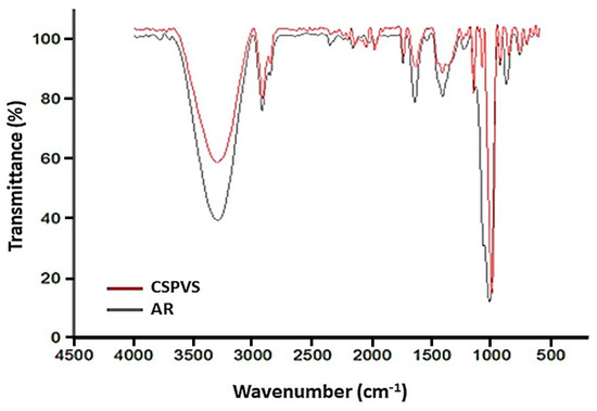 FTIR spectra of the agar (AR) and corn starch and Pistacia vera shell powder (CSPVS) films.