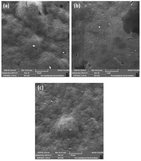 SEM was performed to study the structural morphology at the micron and submicron levels. Figure 3 shows the structural changes in the films with and without Pistacia vera shells. Pistacia vera shells are composed of hemicellulose and lignin. Figure 3a shows a film fabricated using AR, and Figure 3b shows a film fabricated using CS. Ahmad et al. [33] reported that after ultrasonication, starch nanoparticles were irregular in size and shape, similar to the results shown in Figure 3a. Furthermore, the film was rough and exhibited valleys owing to the non-uniform distribution of starch in the AR matrix. Staroszczyk and Janas [36] reported that subjecting starch to microwave radiation reduces its semi-crystalline nature to an amorphous structure. The microwave-treated sample in Figure 3b exhibited a smooth surface with few peaks. Therefore, it is necessary to improve the surface behavior of both the boiled rice water and Pistacia vera shells.