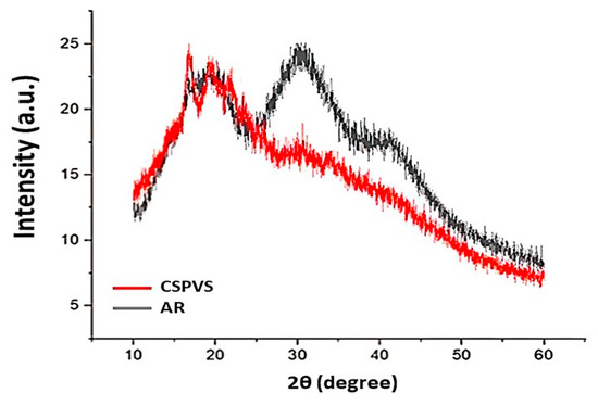 Oluwasina et al. [19] suggested that the presence of moisture in food packaging systems can lead to food contamination. Therefore, a good packaging material is expected to not increase the moisture content of packaged substances. The moisture content results (Figure 9) shows that the CSPVS film had a lower moisture content (16.4%) than the AR film (31.25%). The moisture content varied according to the surface composition of the film. The film prepared with AR had a higher moisture content. Phan et al. [43] reported that the moisture content of AR-based films was higher than that of starch-based films. The variation in the moisture content of the biocomposite film was due to the hygroscopic and hydrophilic nature of the AR and other polysaccharides added along with the boiled rice water.