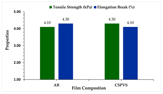 The composition of the film influences its stability and strength. Fathiraja et al. [38] reported that the TS of a film is influenced by the presence of AR with a plasticizer and stabilizing agent (Figure S1, see in Supplementary Materials). The elevated effect of AR on the TS has also been reported for AR-based edible films [39]. The TS value range of CSPVS films was higher than that of the AR films. Elongation at break is another important property for films used in the food packaging industry; however, the AR films exhibited better elongation-at-break values than the CSPVS films. This variation may be due to the composition of biopolymers and fillers added along with the boiled rice water.