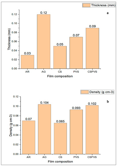 Bio-based packaging materials require toughness to bear the holding pressure. These strength parameters can be assessed using the physicotensile properties of the bio-based materials, such as thickness and density. The results (Figure 7) show that the thickness of all the biocomposite films progressively increased owing to an increase in the concentration of the biofiller added to the film. CS/Pistacia vera shell-based films had higher thickness values than the AR/CS-based films. These results may be linked to the large particle size of the Pistacia vera shells used as the filler. It has been reported that the bio-based film thickness can increase owing to the larger particle size of the added materials [6]. A direct proportional relationship between the thickness and density of the film was observed. The thickness of the film increased with an increasing film density.