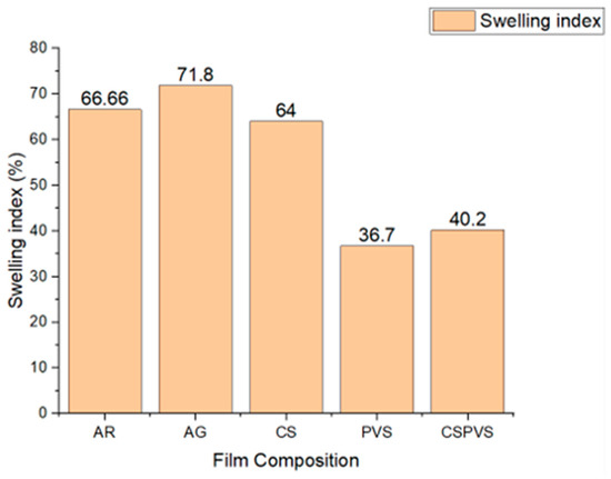 The swelling mechanism of hydrogels is based on the presence of hydrophilic functional groups in the biopolymers [44]. Abdollahi et al. [45] reported that a carboxymethyl cellulose film incorporated with an essential oil exhibited a reduced swelling index. This indicates that the affinity of water molecules for other biopolymers and the oil in the biocomposite film plays a major role in the swelling index of the film. Changes in the affinity of the water molecules indirectly influence the absorption of water by biocomposite films. As shown in Figure 10, the swelling index of the films fabricated using AR and AG were higher owing to the hygroscopic nature of AR. However, the swelling index of the film fabricated using Pistacia vera shells, as compared to the film fabricated using AR alone, was lower. The amylase content influences the swelling capacity and solubility of the film in water by changing the negatively charged elements within the rice starch granules [46].