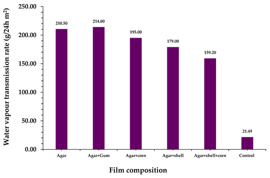 One role of food packaging films is to prevent the entry and transfer of water molecules from the environment to food samples. Therefore, the water vapor permeability should be low (Figure 11) [47]. The rate at which water vapor enters a starch film depends on the diffusivity and permeability of the film. The water molecular absorption ability and surface porosity of a film influences the vapor transmission rate of the food packaging system [48]. The hydrophilic characterization of starch films results in poor moisture resistance [49]. Based on the above study, the boiled rice water-based film also exhibited a lower vapor transmission rate than the control (polyethene sheet film). The film fabricated using PVS exhibited a lower vapor transmission rate (159.2 g/24 h m2), as compared with the film fabricated using AR (210.5 g/24 h m2). These variations may be due to the permeability of the water vapor entering the film.