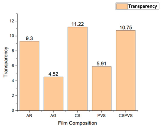 In some food applications, the transparency of film packaging materials is an important parameter. The addition of PVS to the boiled rice water films decreased their transparency (Figure 12). The transparency of the CSPVS film was higher than that of the films in which greater quantities of PVS and AG were incorporated into the starch film. The decrease in transparency may be due to the light scattering of the Pistacia vera shell and AG from the PVS and AG films, respectively.