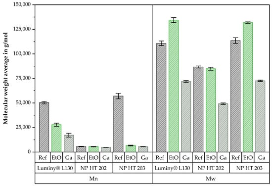 Number average molecular weight Mn and weight average molecular weight Mw of Luminy® L130, NP HT 202, and NP HT 203 before and after sterilization by EtO or Ga; n = 3.