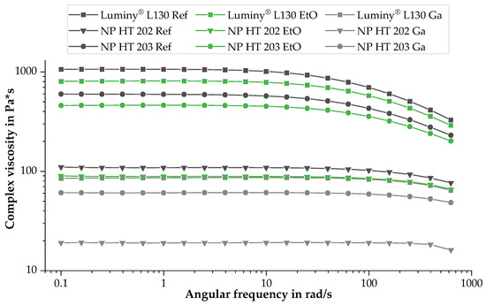 Regardless of the material, the complex viscosity was reduced by EtO sterilization. This result supports the assumption that hydrolytic cleavage of polymer chains occurred during EtO sterilization. A relative decrease of 24% was measured for Luminy® L130. NP HT 202 showed a 23% reduction in viscosity as a result of EtO sterilization, and for NP HT 203 −19% was recorded. Whether the cross-linking reactions mentioned in Section 3.1 also occurred cannot be assessed from these results. In the context of this work, the applied radiation dose led to a decrease in viscosity of at least 80%. The largest reduction (−91%) was observed with Luminy® L130. A relative decrease of 90% and 82% was determined for NP HT 202 and NP HT 203, respectively.