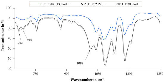In connection with the FT-IR analysis, each measurement spectrum revealed absorption bands at 1044 cm−1 (, 1183 cm−1 , and 1749 cm−1 which are characteristic for pure PLA [3,16,32]. A comparison of the reference samples of all examined materials, which can be seen in Figure 3, shows that both NP HT 202 and NP HT 203 create two additional transmittance peaks at wavenumbers of 669 cm−1, 690 cm−1, and 1018 cm−1, respectively, compared to Luminy® L130. These peaks are attributed to additives present in the material, which have already been identified during GPC sample preparation (as mentioned in Section 3.1).