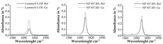 FT-IR absorbance spectrum of the reference and Ga-sterilized samples of all examined materials after baseline and atmosphere correction.