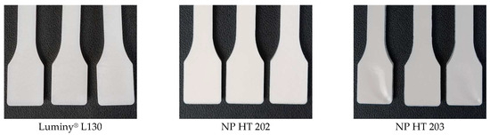To determine Young’s modulus, tensile strength, and elongation at break, a Zwick/Roell Z010 Universal Testing Machine (Ulm, Germany) was used to perform tensile tests with 1A test specimens along the longitudinal axis according to DIN EN ISO 527. The tests were performed with a pre-load of 0.1 MPa and a crosshead speed of 5 mm/min (Luminy® L130; NP HT 202) or 25 mm/min (NP HT 203). Five specimens were tested for each condition.