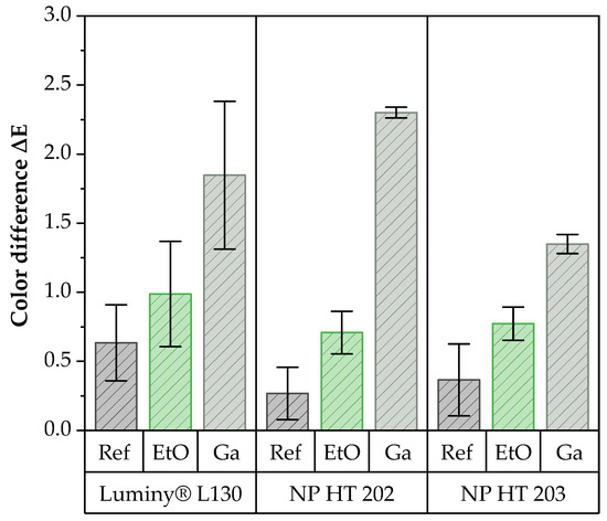 Color difference ∆E of the test specimens in the CIELAB space before and after sterilization with EtO or Ga. A minimum sample size of n = 5 was used.