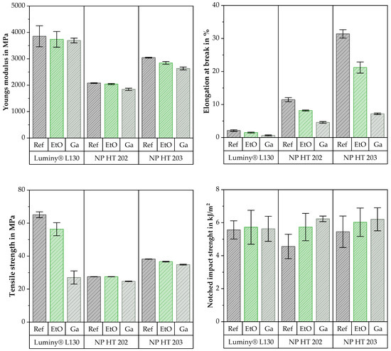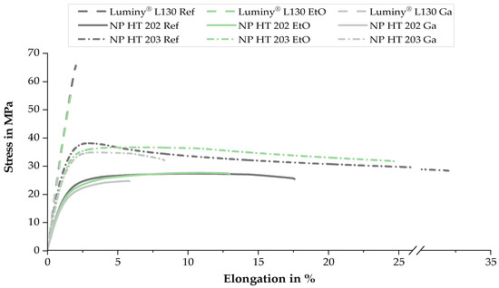 Consistent with Zhao et al. and other studies, the Young’s modulus and tensile strength were either not changed or changed only to a very small extent [3,4,27]. Only Luminy® L130 showed a clear reduction in tensile strength of 9 MPa after EtO sterilization.
