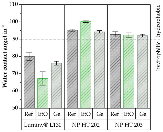 In contrast, the water contact angles of all analyzed materials were slightly reduced by Ga sterilization. In this context, Luminy® L130 showed the comparatively highest reduction in the water contact angle. The literature also documents minor to negligible changes in the water contact angle as a result of Ga sterilization [17,37].