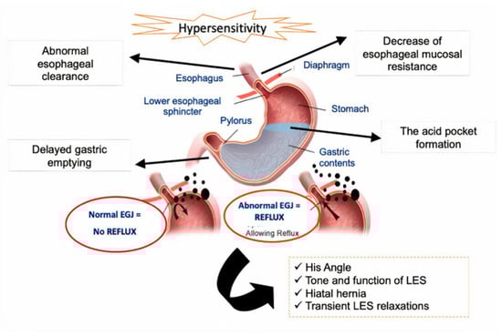 A hiatal hernia exacerbates gastroesophageal reflux by intensifying the contact between stomach acid and the esophagus. It disrupts the interaction between the lower esophageal sphincter (LES) and the crural diaphragm, essential components of the anti-reflux barrier. This impairment in the coupling between the LES and the crural diaphragm contributes to the reflux of stomach contents into the esophagus. Impaired esophageal clearance prolongs the contact between refluxate and the esophageal mucosa, leading to symptoms and potential damage [34,35]. Esophageal motility disorders, delayed gastric emptying, and reduced defensive properties of the esophageal mucosa also contribute to reflux [36,37].