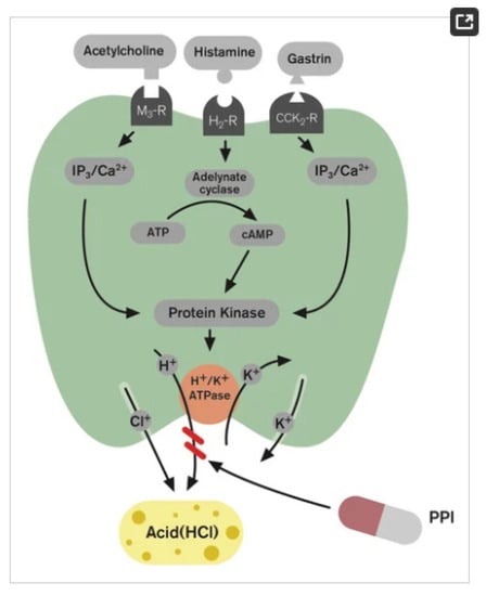 The main triggers for acid secretion in gastric cells are histamine, acetylcholine, and gastrin, to a lesser extent. Various molecules and receptors, such as ATP, cAMP, CCK2-R, H2-R, IP3, M3-R, and PPI, are involved in this process (Figure 2) [60].