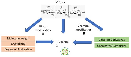 Adding ligands to CS involves attaching specific molecules, called ligands, to the CS molecule. Ligands are often chosen for their ability to bind to target molecules or receptors. This modification can enable CS to interact with specific cells, proteins, or compounds, enhancing its functionality in various applications. For instance, ligand-modified CS can be used in targeted drug delivery, where the ligand helps guide the CS-based carrier to a particular site in the body [138,139]. This approach allows for improved precision and efficiency in therapeutic applications.