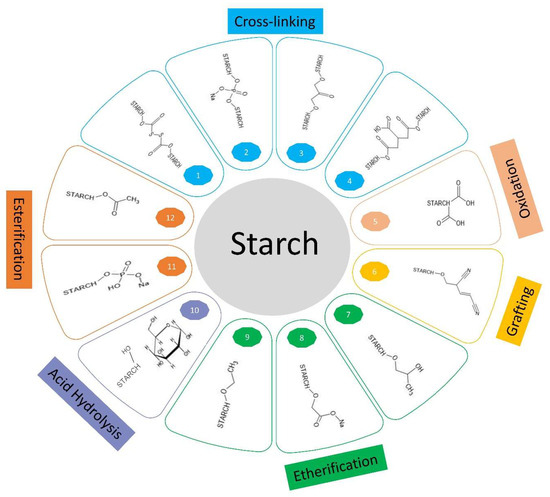During the last decade, the modified starch market has constantly been growing. According to Markets data, the worldwide modified starch trade is expected to be valued at USD 13.7 billion in 2022 and set to gain USD 15.9 billion by 2027, recording a compound annual growth rate (CAGR) of 3.1% (https://www.marketsandmarkets.com/Market-Reports/modified-starch-market-511.html, accessed on 15 August 2023). In addition, the demand for processed and convenience foods is lifting the need for modified starch. Therefore, the usage of modified starch across numerous sectors is expanding as innovative experiments and new technologies in many industrial sectors (food and non-food) progress. Furthermore, due to its high economic and social impact on human life, the starch modification area will be more appealing in the future. Generally, modifications may be divided into two groups, the in planta modifications, which can be achieved by genetic manipulation via breeding and molecular biology technologies. The second group includes all modifications outside the plant system that can be obtained by physical, chemical, and/or enzymatic methods. These modifications will be explained in more detail in the following sections.
