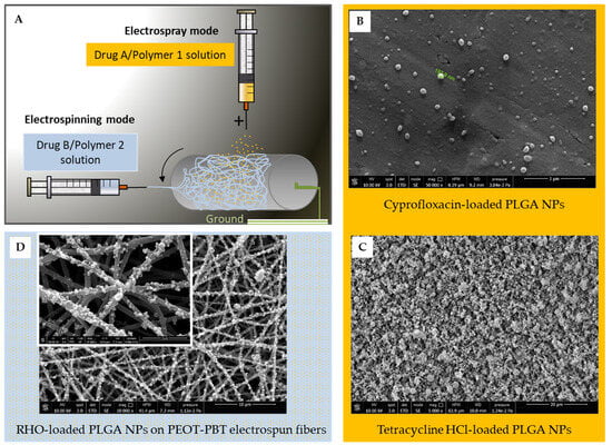 - Günday, C.; Anand, S.; Gencer, H.B.; Munafò, S.; Moroni, L.; Fusco, A.; Donnarumma, G.; Ricci, C.; Hatir, P.C.; Türeli, N.G.; et al. Ciprofloxacin-loaded polymeric nanoparticles incorporated electrospun fibers for drug delivery in tissue engineering applications. Drug Deliv. Transl. Res. 2020, 10, 706–720. [Google Scholar] [CrossRef] [PubMed]