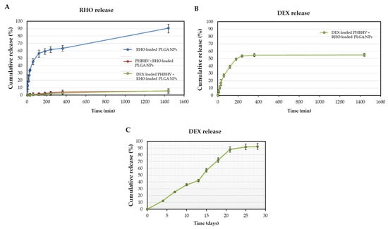 2.6. DEX and RHO Release from PHBHV Meshes and NPs